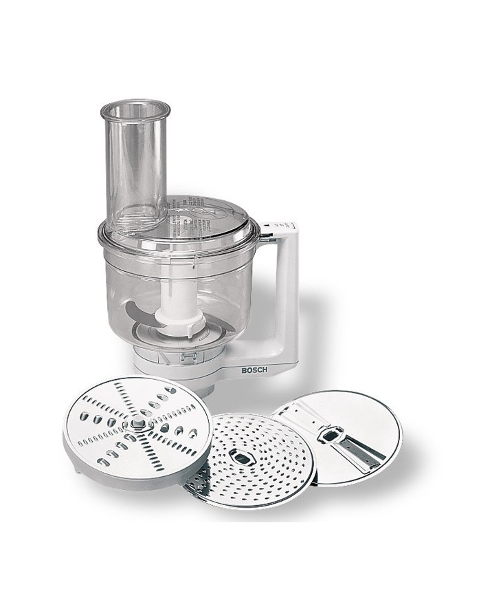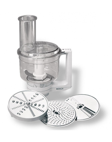 Contenu: 1 couteau, 1 disque éminceur réversible, 1 disque à râper réversible et 1 disque à râper (moyenne à fine)